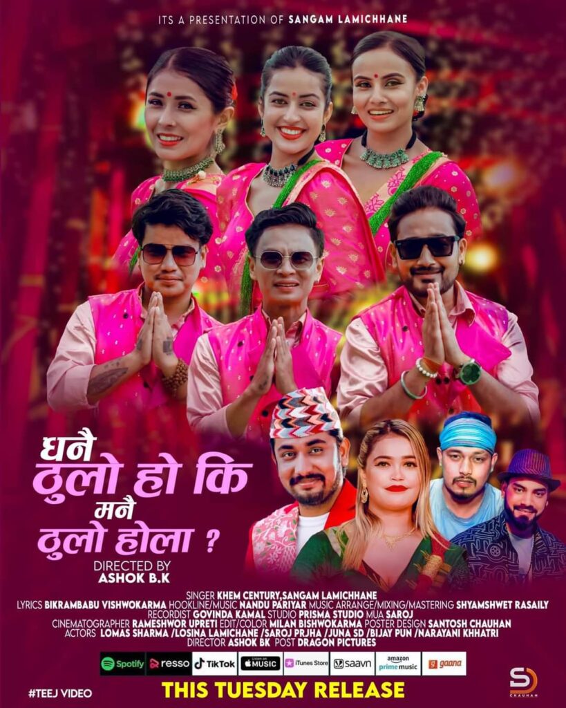 हिन्दू नारीहरुको महान् पर्व तिजको अवसर पारेर बजारमा तिज गीतहरु आउने क्रम तीब्र गतिमा छ । यसैक्रममा गायक खेम सेन्चुरी र गायिका संगम लामिछानेको स्वरमा रहेको तीज गीत ‘धनै ठूलो होकी मनै ठूलो होला’ सार्वजनिक भएको छ । ‘धनै ठूलो होकी मनै ठूलो होला’ गीतको शब्द सिर्जना विक्रमबाबु विश्वकर्माको रहेको छ । नन्दू परियारको संगीत […]