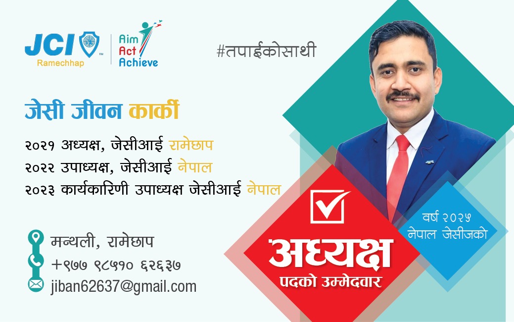 नेपाल जेसीज बर्ष 2025 को लागि देश भरिकै प्रतिनिधित्व गर्नका लागि जीवन कार्कीको अध्यक्ष पदमा उम्मेद्बारी , जीवन कार्की को जन्म रामेछाप जिल्लाको खिम्तीमा भयको हो। उहाँ सानैदेखी असल र सहयोगी भावना भयको ब्यक्तिको हुनुहुन्छ। slc सम्म को अध्यन गाउकै बिधालय मा गरेका थिय भने bachelor सम्म काठमाडौ मा गर्नु भएको थियो। जेसिज यात्रा को कुरा गर्नु पर्दा 2017 मा रामेछाप जेसीज मा सदस्य हुँदै 2021 मा रामेछाप जेसीज को साखा अध्यक्ष हुँदै 2022 मा नेपाल जेसीज को राष्ट्रिय उपाध्यक्ष र 2023 मा कार्यकारिणी उपाध्यक्ष हुँदै 2025 को लागि राष्ट्रिय अध्यक्ष को लागि उम्मेद्बारी दिनु भयको छ। उहाँ भन्नू हुन्छ एक पटक मलाई राष्ट्रिय अध्यक्ष बनाउनु भयो भने नेपाल जेसीज को हितमा हुने काम गर्छु र Aim Act achieve को थिमा रहेर जेसीज लाई आगाडी लाने उहाको उदेश्य रहेको छ। सम्पुर्ण जेसीज आबद्ध हुनुहुने सम्पुर्ण जेसीज मन हरु लाई तपाई को साथी जेसी जीवन कार्की लाइ अमुल्य मत दियर जिताउन हार्दिक अनुरोध गर्दछौं।