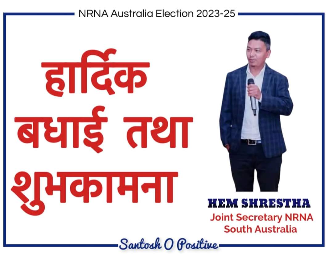 साउथ अस्ट्रेलिया गैर आवासीय नेपाली को निर्बाचन सम्पण भयको छ। जस्मा रामेछप का भिम श्रेस्ठ कोषाध्यक्ष पद मा निर्बाचित भयका छन